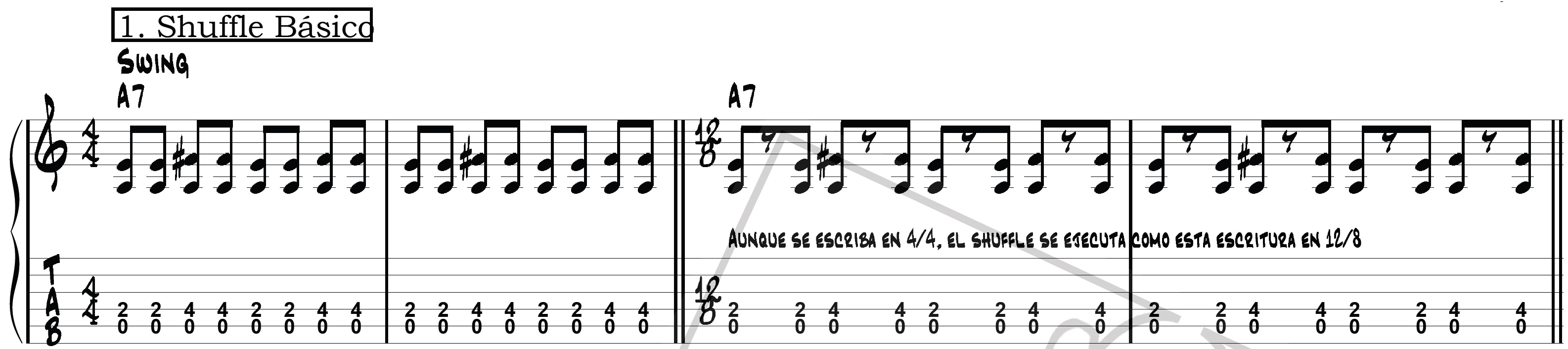 El ritmo más característico del blues es el «shuffle». Se suele escribir en 4/4 como si fueran corcheas normales, aunque se ejecuta como un tresillo con la corchea del medio en silencio, como podéis ver en la siguiente imagen (click para ampliar). Debajo de ella tenéis cómo suena. En cada uno de los tres acordes se hace lo mismo.