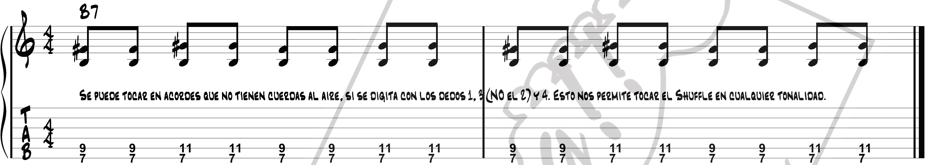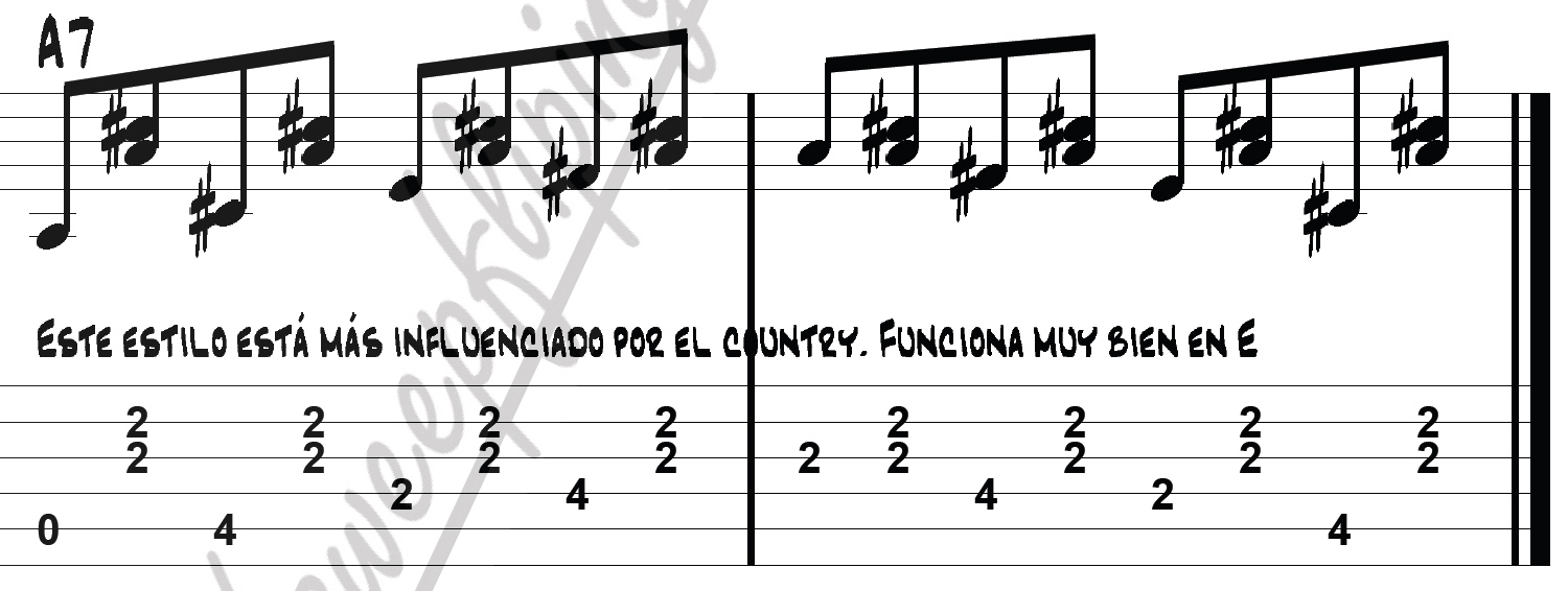 Aunque es común utilizar tonalidades que permiten el uso de cuerdas al aire (como un blues en A, o en E), este patrón de acompañamiento se puede llevar a cualquier traste utilizando los dedos 1, 3 y 4, por ejemplo a B: