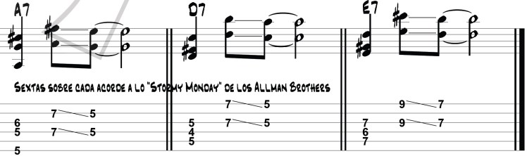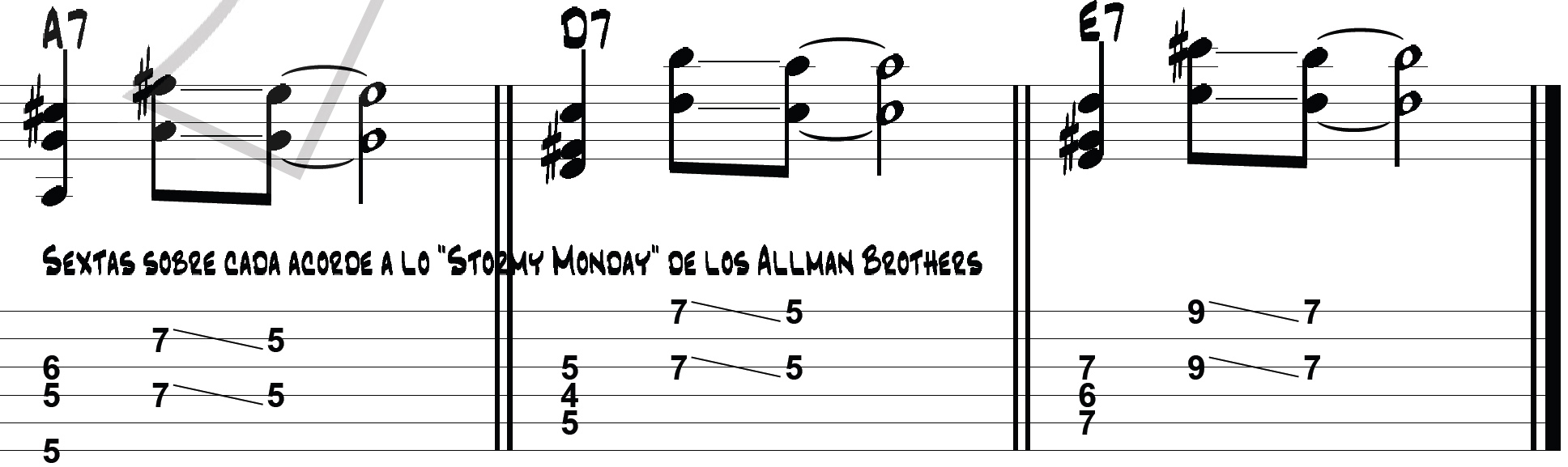 En cada uno de los tres acordes se suele hacer lo mismo, siguiendo la estructura que sea (12 compases, 8 compases, etc). Estos patrones son válidos únicamente en Blues Mayor, porque en menor no se utilizaría la sexta mayor.