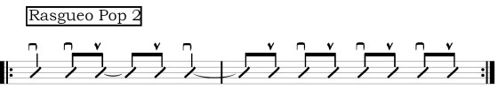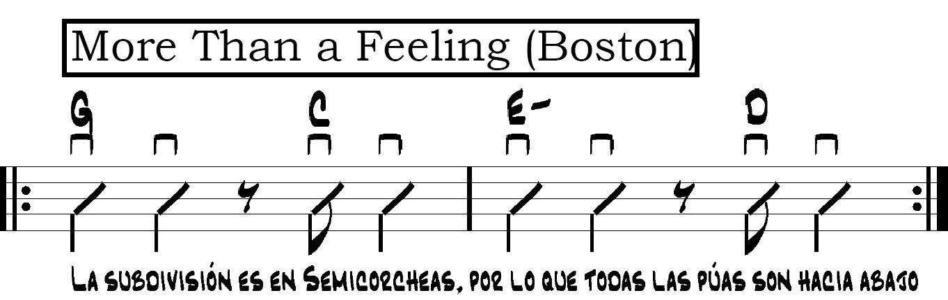 Este rasgueo y el siguiente son, no sé por qué, los que más usan los guitarristas que solo tienen un ritmo. Es útil conocerlos, y realmente suenan bien, pero se trata de poder elegir otras opciones también.