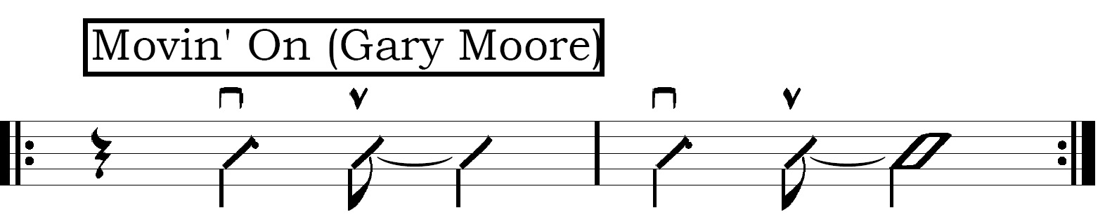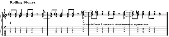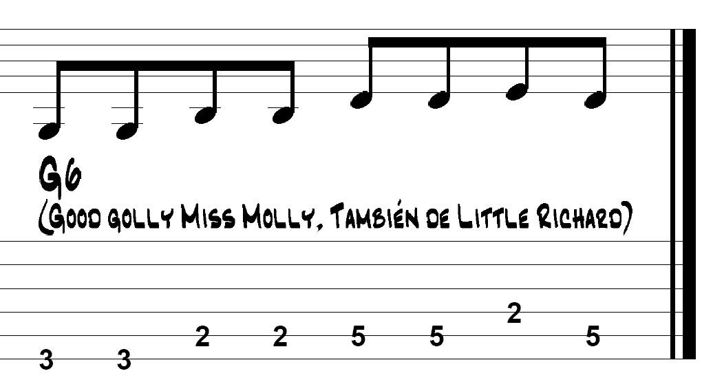 Esta forma de adornar un acorde Mayor en la 5a cuerda, haciendo cejilla con el dedo índice, es muy común en el rock. Podemos encontrar ejemplos en la música de Chuck Berry, The Rolling Stones, Status Quo e incluso Judas Priest