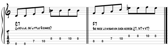 En este caso, más que rasguear los acordes, vamos tocando sus notas de forma melódica (lo que viene a ser un arpegio). El Rock’nroll de los años 50 consistía básicamente en seguir las mismas estructuras del blues, pero sin hacer swing en las corcheas, y a un tempo considerablemente más rápido.