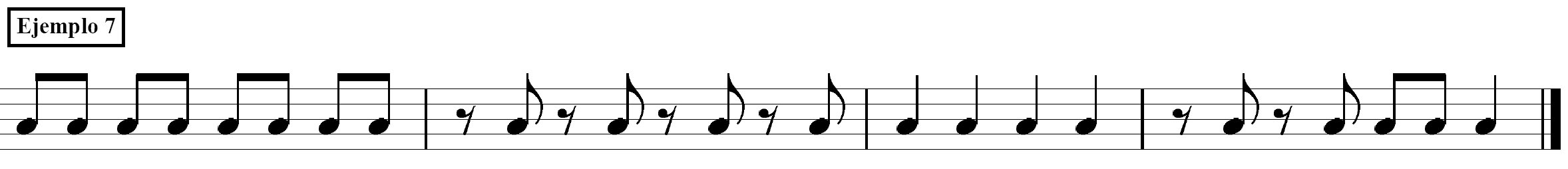 Ahora vamos a ponerlo en práctica. En la siguiente imagen se muestra un ritmo, que podéis oir leido por mí (exagerando bastante las «-A»s) en el audio de debajo, o con un sonido MIDI en el siguiente (este sonido es más como el ritmo real, y escucharlo os ayudará a suavizar las «A»s, que simplemente hacemos para facilitar la lectura). Oyendo los audios en los que leo los ritmos también comprenderéis por qué la gente cree que los músicos nos drogamos o hacemos ritos satánicos. Solo estamos leyendo.