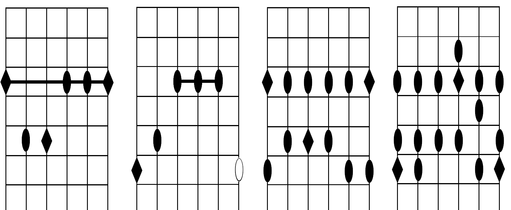 - Tocar secuencias de acordes sin salir de un espacio de 5 trastes. Aparte de progresiones de acordes sacadas de canciones que conocemos, podemos practicar esto con ciclos de cuartas diatónicas, usando los tipos de acorde que corresponden a la tonalidad, en tríadas o en cuatríadas (por ejemplo, en C Mayor podríamos tocar las tríadas C, F, Bdim, Emin, Amin, Dmin, G y vuelta a C, o las cuatríadas Cmaj7, Fmaj7, Bmin7b5, Emin7, Amin7, Dmin7, G7 y vuelta a Cmaj7, todo ello sin que ninguna nota salga de los trastes 1-5). Hacerlo en varias tonalidades, o en diferentes espacios de 5 trastes (1-5, 3-7, etc), nos obliga a combinar todas las posibles formas de los acordes. También podemos tomar un solo tipo de acorde (por ejemplo, Mayor) y tocar todos los acordes de ese tipo siguiendo el ciclo de cuartas: C, F, Bb, Eb, Ab, Db, Gb, B, E, A, D, G y C, etc.
