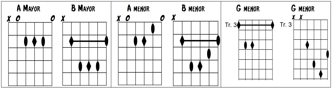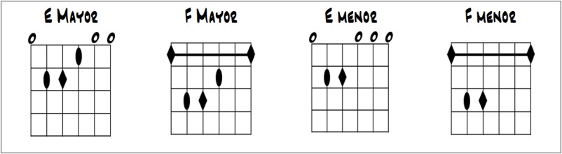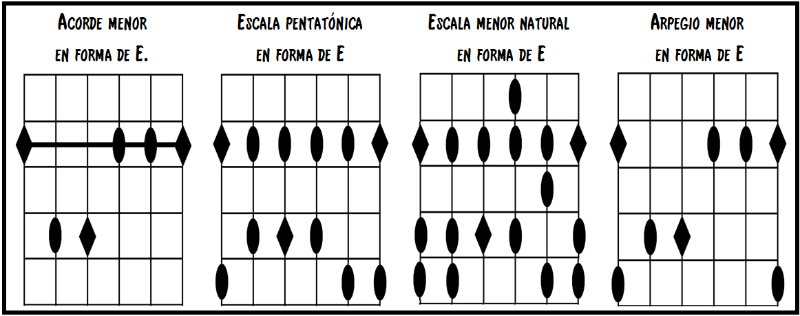 Lo mismo ocurre con los acordes de tríada menor. Para hacer un acorde de Fmin, llevaríamos sobre él la misma forma de Emin, pero haciendo cejilla sobre el traste 1. Y llevando esa posición sobre cualquier nota de la 6ª cuerda, tendríamos el acorde menor que se forma sobre esa nota. Por ejemplo, llevando la posición al traste 3, que corresponde a la nota G, obtendríamos un acorde de Gmin. En la 5ª cuerda arrastraríamos de igual manera la posición de Amin para obtener Bmin (traste 2), Cmin (tr. 3), etc. A lo largo de la 4ª cuerda, podemos desplazar la posición de Dmin sobre el traste que sea. Por ejemplo, otra forma de tocar un Gmin sería llevar la forma de Dmin sobre el traste 5 de la cuarta cuerda.