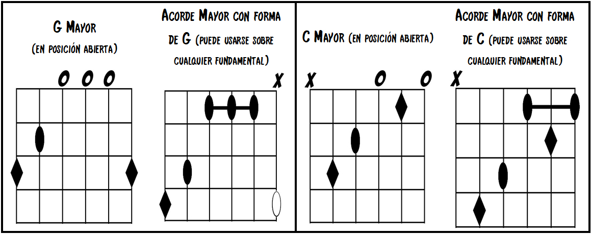 Bien, el principio es bastante simple: cuando tocamos los acordes en posición abierta (con cuerdas al aire), nos salen básicamente 5 posiciones distintas: las de los acordes de C, A, G, E y D (el resto pueden considerarse las mismas posiciones pero llevadas a otros trastes, ver el siguiente párrafo). La palabra CAGED en inglés significa “enjaulado”, y con ella recordamos no sólo todas las digitaciones que puede tener un acorde, sino también el orden en el que aparecen a lo largo del mástil.