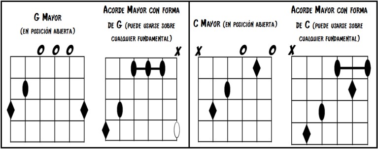 Pero aparte de esas formas, también podemos usar las de C y de G, que sin duda son más incómodas para los acordes (puesto que para hacer la cejilla en ambos casos se requiere una mayor apertura de la mano), pero que nos permiten completar todas las posiciones de un tipo de acorde. La forma de C es, además, la más cómoda para digitar un arpegio, y la que mejor nos permitirá comenzar a usar la técnica de sweep picking, como veremos más adelante.