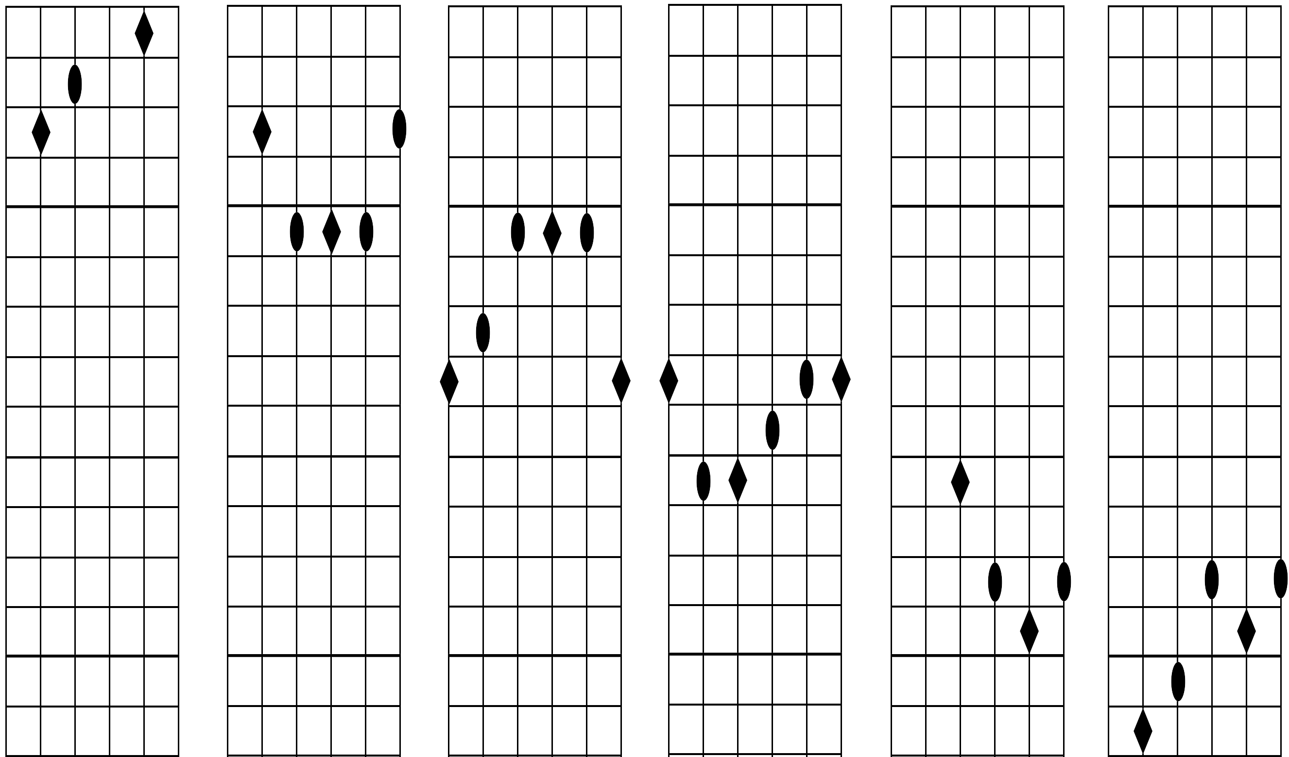 - Recorrer las columnas. Esto nos permitirá observar cómo un mismo acorde, sobre la misma fundamental, va apareciendo a lo largo del mástil. Gracias a esta práctica, conseguiremos visualizar cómo unas formas se solapan con otras.