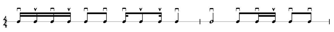 En el siguiente ejemplo, la figura más pequeña sería la semicorchea. Todas las figuras más grandes, es decir, corcheas, negras y blancas, se atacan hacia abajo. Las semicorcheas impares (1 y 3 de cada tiempo) se atacan hacia abajo , y las pares (2 y 4) hacia arriba. El símbolo de púa abajo es «Π» y púa arriba es «v».