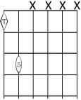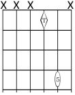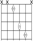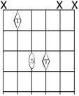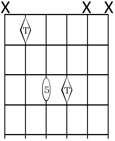 Forma 1: Esta es la forma más común de tocar este tipo de acordes, con sólo dos notas. Respecto a cualquier nota en cualquier cuerda (menos la cuerda 3), la 5ªJusta está en la cuerda inmediatamente inferior, a dos trastes. Ubicando el rombo (la Tónica) sobre cualquier nota, tocaremos el acorde de quinta de dicha nota siempre con esta forma, excepto en cuerda 3.