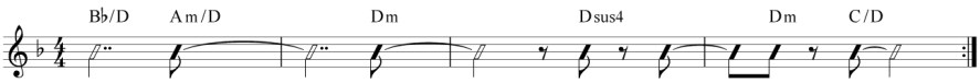 Ejemplo 3: Eye of the Tiger, de Survivor, de 0:49 a 1:06. En este caso, sólo se recurre al bajo pedal en la primera estrofa, lo que le confiere un carácter de introducción. Es genial ver la misma melodía y los mismos acordes en la segunda estrofa y redescubrirlos de una manera distinta a como han aparecido antes. El tercer acorde de este pasaje, Bb/C, es un híbrido.