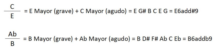 Se expresan en forma de fracción, separando los dos acordes que los forman, generalmente dos tríadas, arriba (notas agudas) y abajo (notas graves, acorde base). No son híbridos; se trata de un concepto diferente, y lo aclaro porque he encontrado un libro bastante extendido (no diré cual, porque por lo demás está muy bien) que los tiene por sinónimos. No es así. Si bien es cierto que si usamos un híbrido formado por el acorde superior y la nota baja del acorde inferior podemos sugerir el sonido de un poliacorde, éste no quedaría completo.