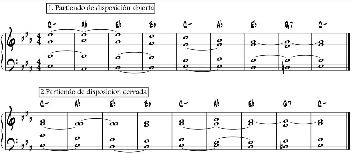 En el ejemplo 1, el G7 no lo he presentado completo, haciendo sólo la tríada, que me permitía un enlace más suave.
