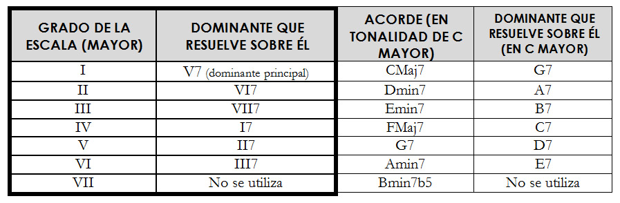Así que si pensamos en un dominante que resuelva a salto de 4ª sobre cada grado de la tonalidad, obtenemos las siguientes posibilidades (a la derecha del recuadro, los acordes y sus dominantes en tonalidad de C Mayor):