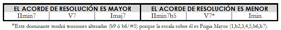 No todos los segundos relativos son iguales; si el grado sobre el que vamos a resolver es Mayor, el segundo relativo será grado II de una tonalidad Mayor, y por tanto será un acorde min7. Por el contrario, si el acorde sobre el que va a resolver un dominante es menor, ese V7 proviene de una escala menor armónica, y en este caso el grado II fundamenta un acorde de tipo min7b5 (semidisminuido). Así que nos encontraremos dos tipos de progresiones II, V, I: