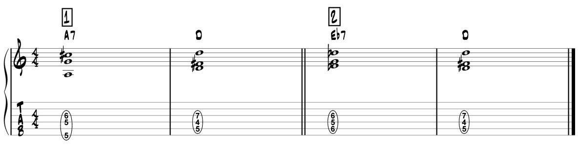 1: A7 resuelve sobre D. El tritono está formado por las notas G y C#, en las cuerdas 4 y 3, respectivamente. La voz de G baja un semitono hasta F# a la vez que la de C# sube un semitono hasta D, resolviendo el tritono/ 2: Eb7 resuelve sobre D. El tritono está formado por las notas G y Db (enarmónica de C#), en las cuerdas 4 y 3, exactamente en los mismos trastes que antes. La resolución del tritono es igual que en el caso 1.