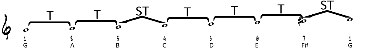 Cualquier escala que esté formada por los mismos intervalos que Do Mayor (y por tanto, la misma sucesión de tonos y semitonos) es una escala Mayor. Este tipo de escala se puede fundamentar (es decir, tener su Tónica) sobre cualquiera de las 12 notas. Veamos por ejemplo cómo construir la escala de Sol Mayor: Primero, pensando en la estructura de tonos y semitonos, por si acaso todavía hay que pelearse un poco más con los intervalos: Empezamos en Sol, y tiene que haber un tono hasta la siguiente nota, así que ponemos La. Desde La, tiene que haber otro tono hasta la siguiente nota, así que apuntamos Si. Ahora necesitamos una nota que esté a un semitono desde Si, y estamos de suerte: tenemos Do. Ya llevamos las notas Sol, La, Si y Do, y cumplen la estructura Tono, Tono y Semitono. Hasta aquí todo ha ido bien. Ahora vienen los tres tonos que van seguidos. A un tono de Do, tenemos Re. A un tono de Re, tenemos Mi. A un tono de Mi, tenemos Fa sostenido, NO FA, que estaría a medio tono. Así que ya hemos tenido que alterar una nota para forzarla a que coincida con la estructura que queremos. Por último, necesitamos un semitono, y desde Fa# llegaríamos a Sol. En resumen, para tocar la escala de Sol Mayor tendremos que alterar la nota Fa, cambiándola por Fa#, y las demás serán naturales, como en Do Mayor. La escala Mayor de Sol sería, pues: Sol La Si Do Re Mi Fa# (Sol, etc).