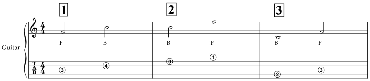 En la escala de Do Mayor, se forma un tritono entre las notas F y B. De F a B el intervalo es #4 (ver 1). Si subimos F una octava (ver 2) el intervalo queda invertido, pero la distancia de B a F sigue siendo un tritono (b5). Si en vez de subir F una octava, bajamos B una octava (ver 3), la distancia sigue siendo una b5 = Tritono. Recomiendo escucharlo en la guitarra, por eso he incluido la tablatura.
