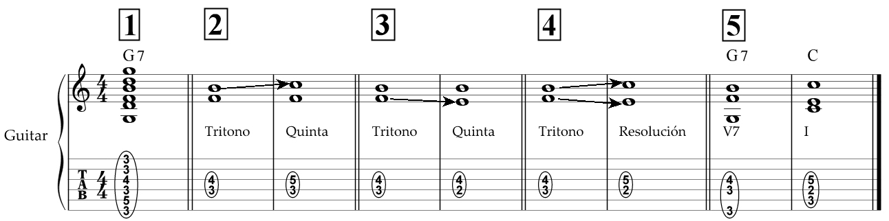 1: El acorde de G7 con forma de cejilla y fundamental en sexta cuerda./ 2: El tritono se forma entre las notas F(4ª cuerda) y B (3ª cuerda). Al mover B un semitono hacia arriba, se forma una 5ª Justa./ 3: Partiendo del tritono que contiene el acorde, se puede formar otra 5ª Justa bajando F un semitono, hasta E./ 4: Los dos movimientos simultáneamente sugieren la sonoridad de un acorde de G7 seguido de uno de C Mayor./ 5: Añadiendo las notas bajas de ambos acordes, obtenemos una cadencia perfecta: G7, C.