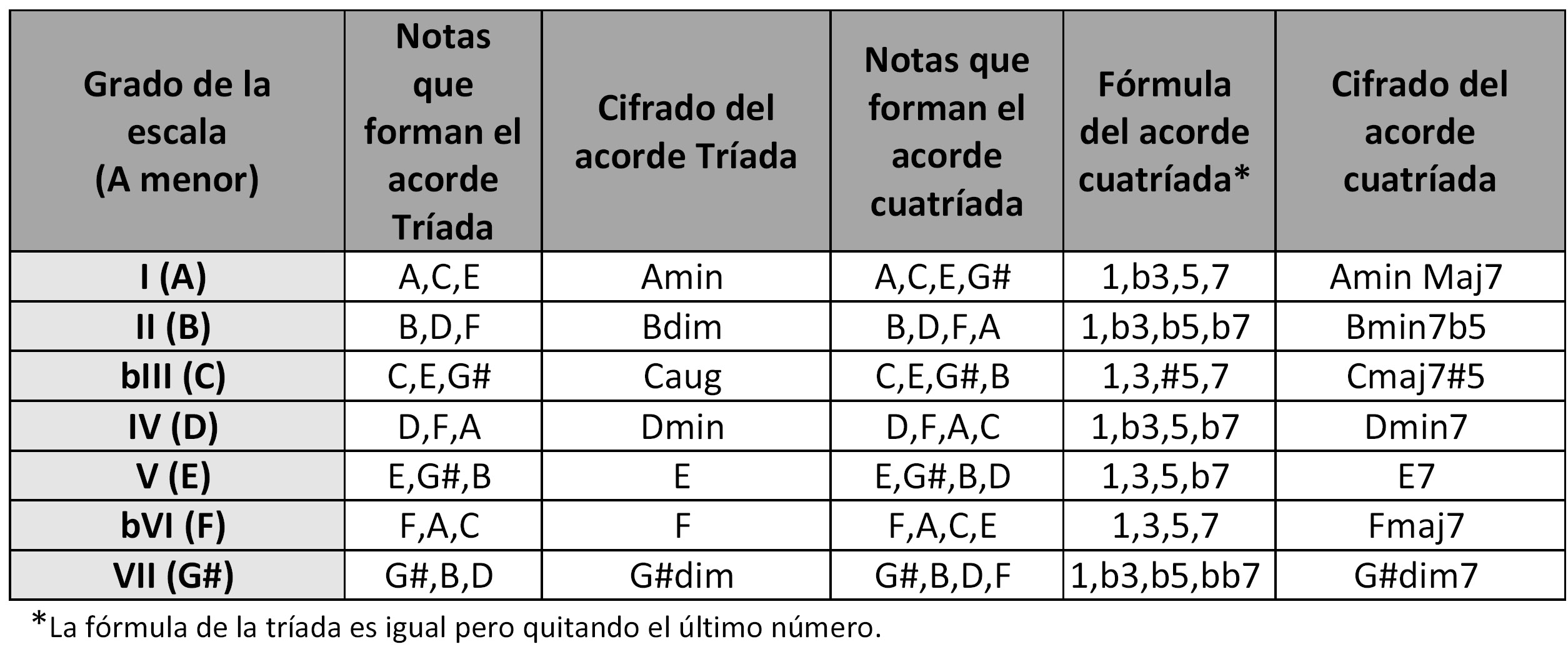 Recordemos que la escala menor natural tiene la fórmula (1,2,b3,4,5,b6,b7). En la escala de La menor, la nota que cambia es Sol, su séptima, que pasa de ser menor a mayor. Así que la escala menor armónica tiene la fórmula (1,2,b3,4,5,b6,7).