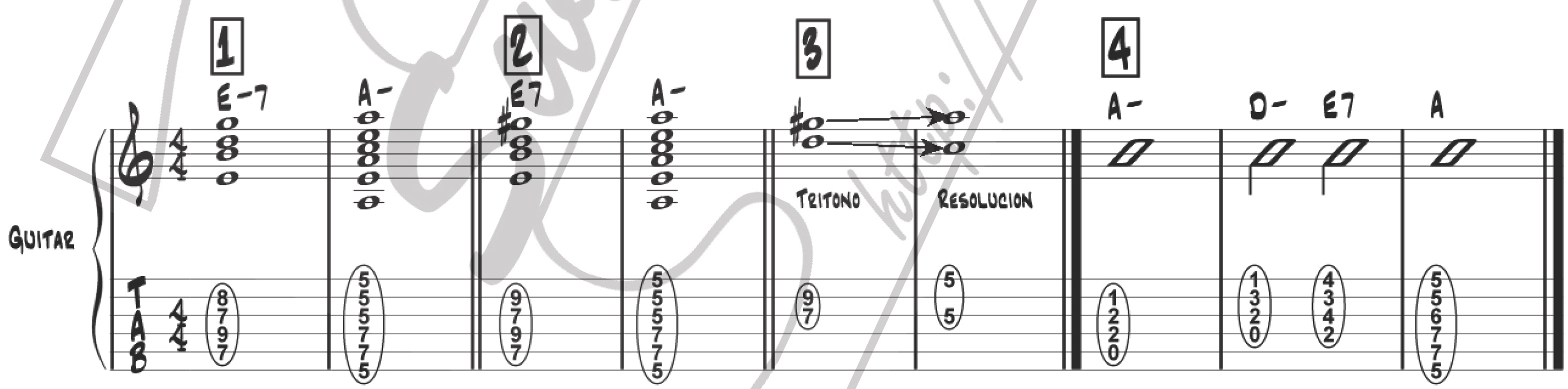 1: El acorde de E-7 no contiente tritono y no exige el movimiento hacia A- como lo haría un dominante. 2: Cadencia perfecta entre E7 y A-. 3: Aislando el tritono en E7, las dos notas que lo forman son D y G#. La voz superior avanza un semitono hasta A, y la inferior retrocede un tono hasta C, que es la b3 de A. El efecto de resolución es más leve que si el acorde final fuera A Mayor (con C# en vez de C), pero es suficientemente conclusivo. 4: Cadencia picarda: estamos en tono de A menor, y los últimos acordes son E7 y A Mayor.