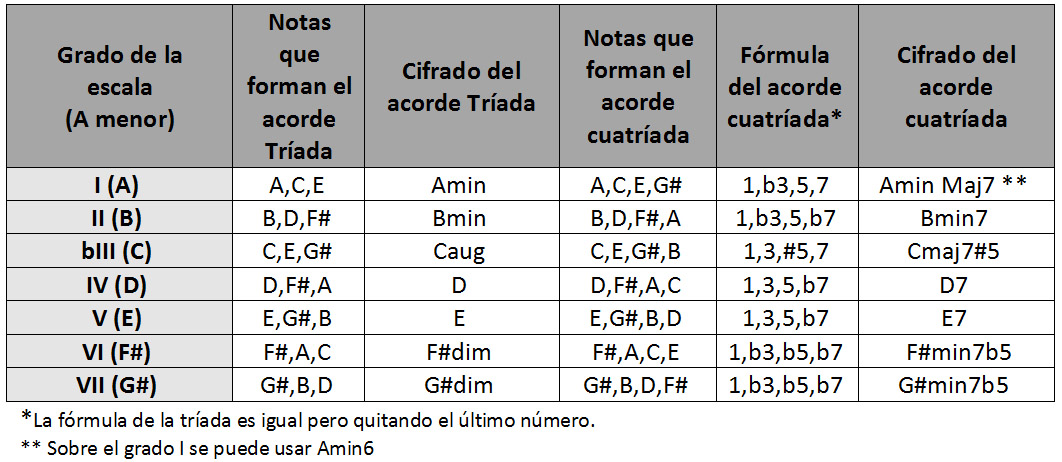 Como ya hicimos con las escalas Mayor, menor natural y menor armónica, podemos formar acordes de tríada o cuatríada superponiendo terceras sobre cada uno de los grados de la escala, utilizando únicamente las notas que pertenecen a ésta. Como ejemplo, detallo a continuación los acordes de la escala de A menor melódica: