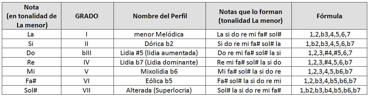 Al igual que la escala menor armónica, la escala menor melódica da lugar a siete perfiles, cuyos nombres y fórmulas se detallan en el siguiente cuadro: