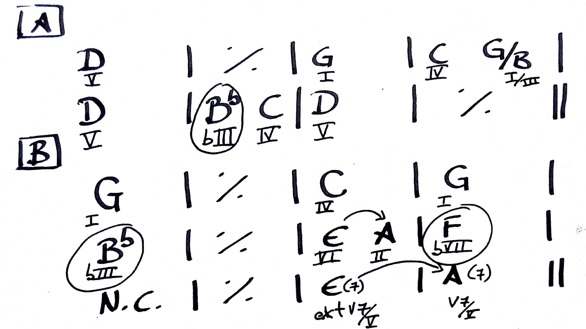 I7: Proviene del Mixolidio. Aunque otras escalas, como la escala de Blues, son aplicables. Si nos lo encontramos con tensiones alteradas (b9, b13, #5, etc), la escala a aplicar sería Frigia Mayor o Alterada, aunque en este caso es difícil que lo podamos considerar como un intercambio modal. Cuando nos encontramos un dominante no diatónico a la tonalidad principal, hay que sospechar que puede ser un dominante secundario o sustituto. Los acordes que lo rodean nos sacarán de dudas.