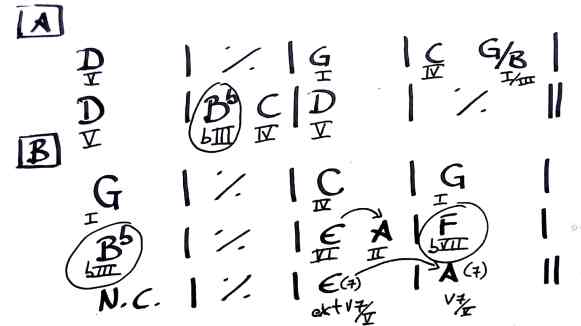En Crazy Little Thing Called Love, de Queen, tenemos dos elementos de intercambio modal. Hay otros acordes no diatónicos, como el VI (Mayor en vez de menor) y el II (también Mayor), aunque podrían considerarse dominantes secundarios (o por extensión en el caso del VI) reducidos a un acorde de tríada. Como sea, estamos en D Mixolidio (aunque el análisis lo he hecho con respecto a G Mayor, que es la misma tonalidad), y encontramos un Bb mayor, que es el bIII (con respecto a G, y bVI con respecto a D. Creo que se observan mejor los grados que pertenecen a la tonalidad numerando con respecto al I de la misma, aunque el centro tonal sea el V) y proviene de D Eólico ( = G Dórico). En la parte B, aparte de volvernos a encontrar el Bb mayor, aparece un F mayor que es el bVII (de G) y que proviene de G mixolidio ( = D Dórico). O sea, el tema está en D mixolidio y toma prestados acordes de D Eólico y de D Dórico. A continuación el análisis en imagen (la armonía está simplificada):