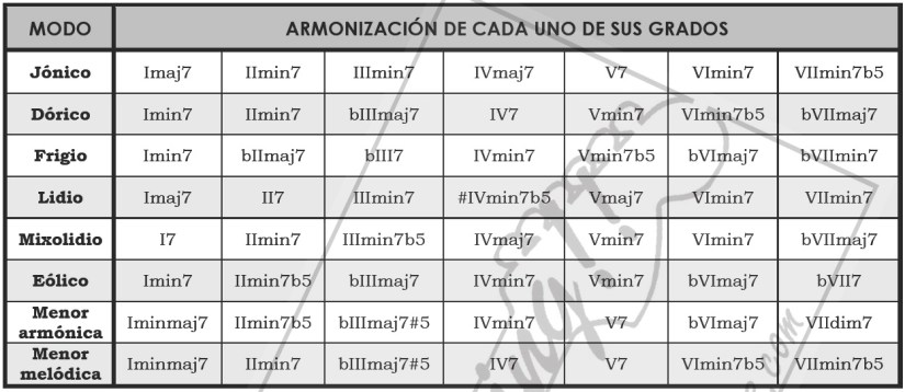 En la siguiente tabla se muestran los acordes que forma cada modo sobre cada uno de sus grados. Comparando la armonización de unos modos con otros podremos ver qué acordes pueden aparecer “prestados” de otros modos paralelos.