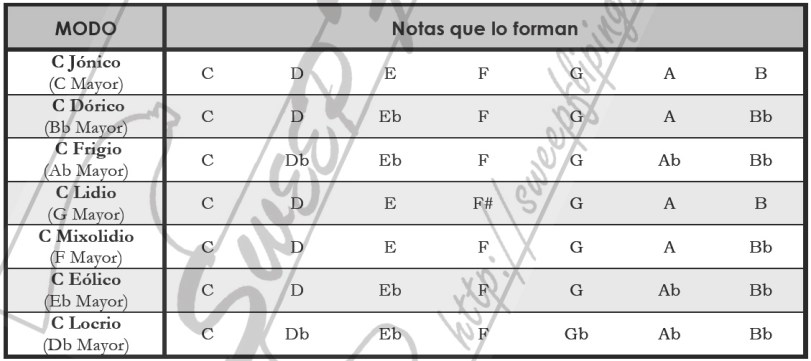 En la tabla a continuación se pueden ver las notas que forman los 7 modos paralelos sobre Do. Cada uno pertenece a una tonalidad distinta.