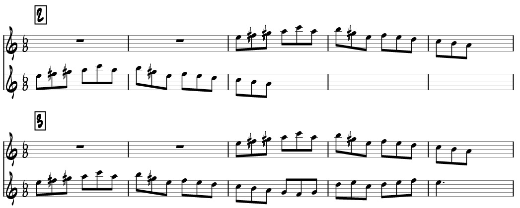 - Continuar repitiendo estos pasos hasta terminar la frase musical con cuidado de que el tercer fragmento de la 1ª voz no sea igual al primero, porque entonces el canon resultante sería una especie de bucle que repite un solo motivo en una u otra voz alternativamente.